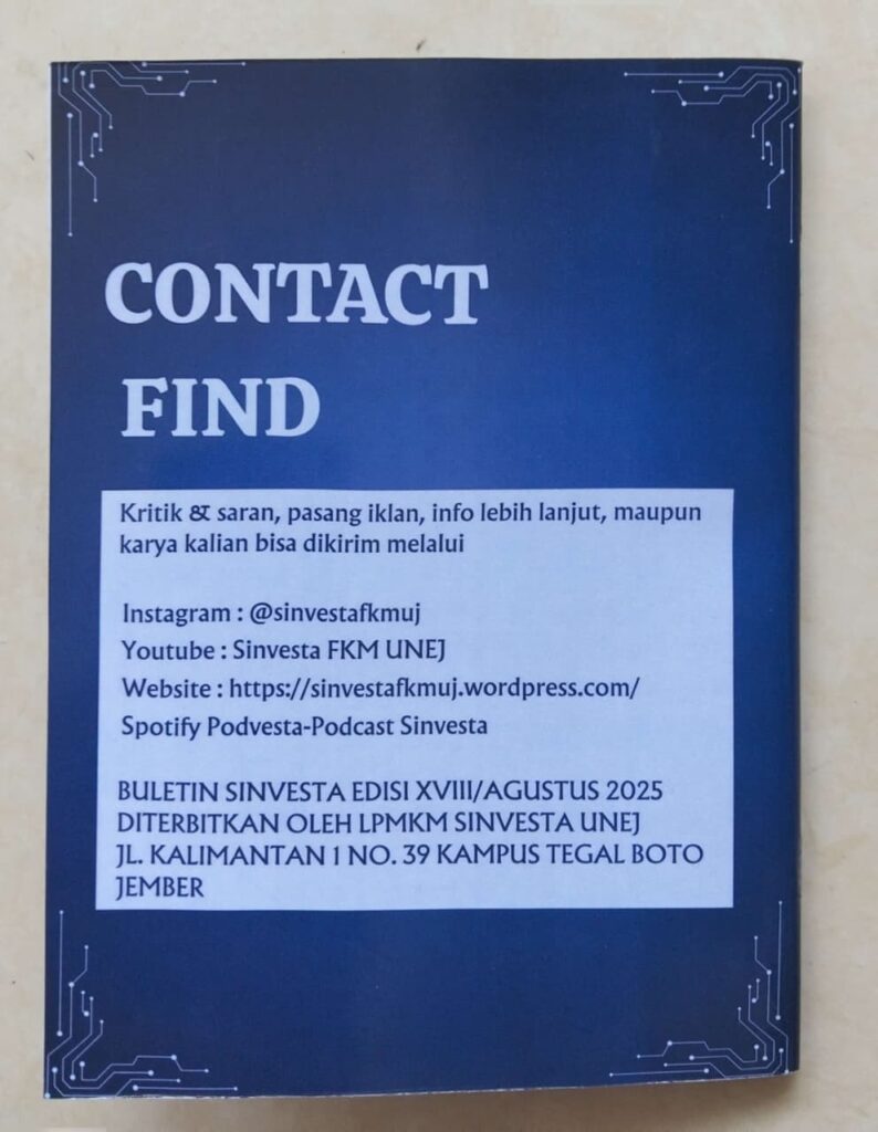 Buletin Sinvesta merupakan salah satu program kerja tahunan dari UKM LPMKM Sinvesta Fakultas Kesehatan Masyarakat Universitas Jember. Pada tahun 2025, tim redaksi kembali menghadirkan dua edisi sekaligus, yaitu Buletin Sinvesta Edisi XVIII dengan tema “Mahasiswa dan Artificial Intelligence: Peluang, Tantangan, dan Inovasi di Era Digital” serta Buletin Sinvesta Edisi XIX bertema “Overthinking dan Produktivitas: Tantangan Mental di Kalangan Mahasiswa”. Kedua edisi ini menjadi wadah bagi mahasiswa untuk menuangkan gagasan, hasil tulisan, dan pandangan kritis terhadap isu-isu yang dekat dengan kehidupan akademik dan sosial mahasiswa.