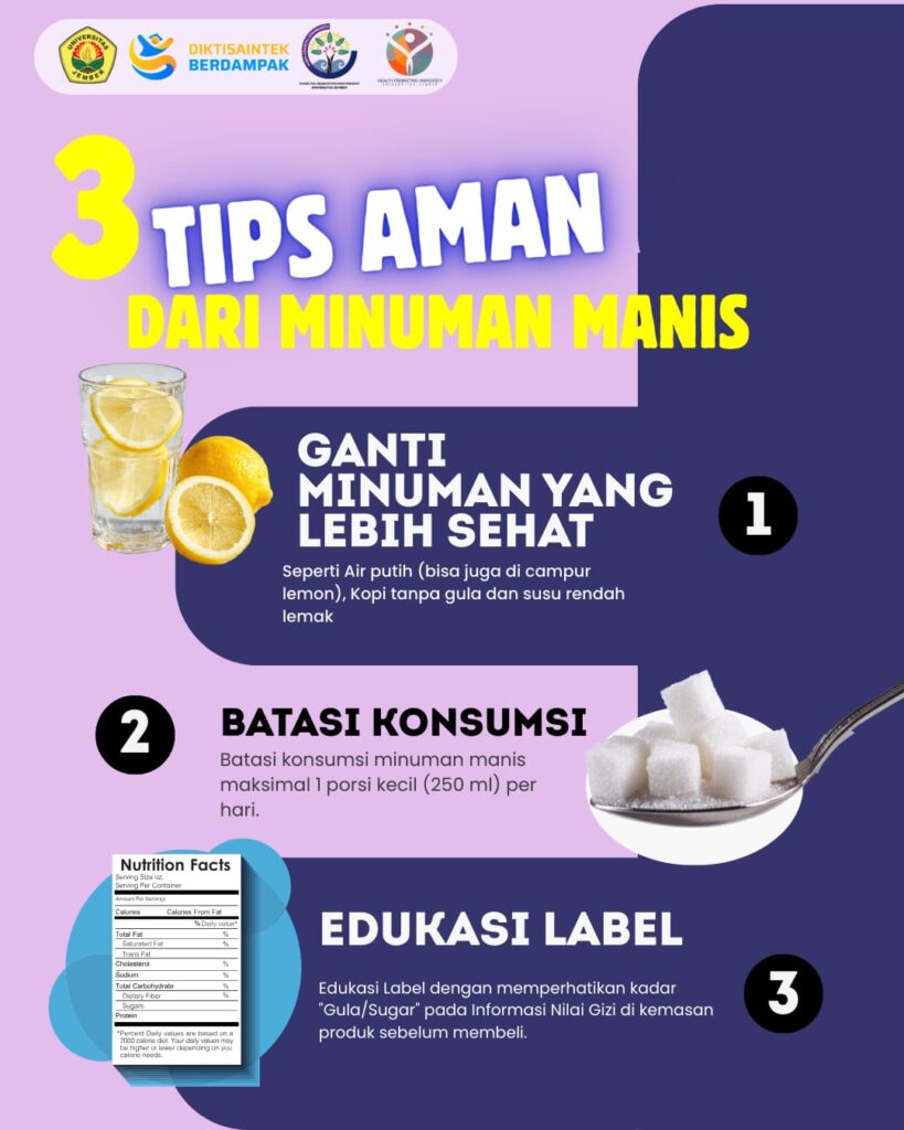 Menanggapi fenomena ini, tim Germas FKM UNEJ mengajak seluruh mahasiswa untuk mulai bijak dalam memilih apa yang mereka minum. Langkah awal yang paling sederhana adalah dengan mulai membiasakan diri membaca label informasi nilai gizi pada kemasan produk dan memperhatikan kadar gulanya. Sebagai alternatif, air putih atau infused water dengan potongan buah segar tetap menjadi pilihan terbaik untuk menghidrasi tubuh tanpa beban kalori. Membatasi konsumsi minuman manis maksimal satu porsi kecil sehari atau menjadikannya sekadar hadiah sesekali (self-reward) adalah langkah kecil yang akan berdampak besar bagi kesehatan jangka panjang. Melalui gerakan “Tantangan 7 Hari Tanpa Minuman Manis”, mahasiswa diharapkan dapat memutus siklus kecanduan gula demi masa depan yang lebih bugar dan produktif.