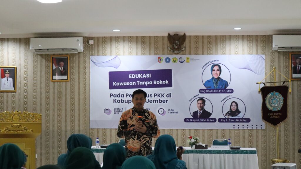 Dr. Nuryadi, S.KM.,M.Kes. bersama Tim Fakultas Kesehatan Masyarakat menggalakkan edukasi KTR kepada salah satu kelompok strategis yang memiliki peran penting dalam edukasi kesehatan, yakni Pemberdayaan Kesejahteraan Keluarga (PKK) Kabupaten Jember. Kegiatan bertajuk “Edukasi Kawasan Tanpa Rokok kepada Pengurus PKK di Kabupaten Jember” dilaksanakan pada hari Sabtu, 4 Oktober 2025. Iken Nafikadini, S.KM.,M.Kes. melaporkan kegiatan tersebut dihadiri oleh 25 Pengurus PKK Kabupaten Jember di Aula PKK Kabupaten Jember dan 180 Pengurus PKK Kecamatan di Kabupaten Jember melalui zoom meeting.