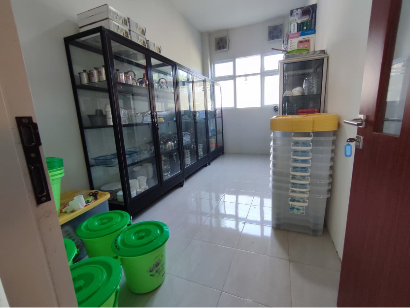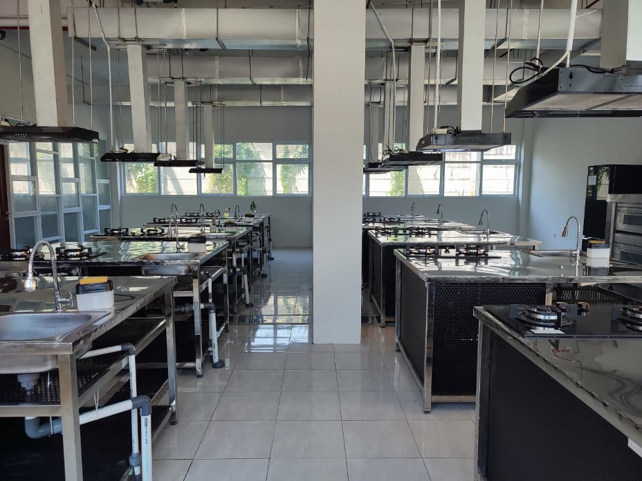 - Lab ini menonjol dengan dapur praktik modern yang dilengkapi meja stainless steel, kompor, sink, serta exhaust hood di setiap unitnya. Selain itu, terdapat lemari display kaca untuk menyimpan peralatan makan dan masak, mendukung mahasiswa dalam praktik perancangan menu dan pengolahan makanan diet (dietetik kulinari).