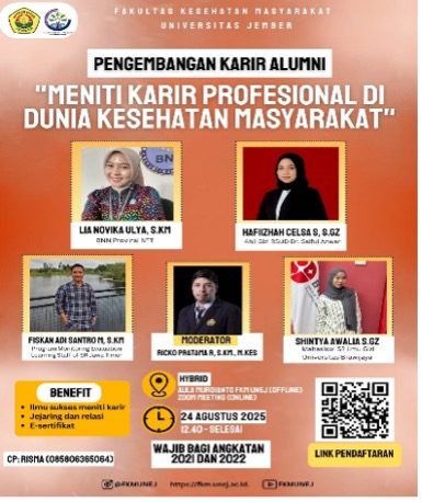 Pengembangan Karir Alumni FKM merupakan kegiatan yang berfokus pada pemberian wawasan, motivasi, serta strategi dalam meniti karir bagi mahasiswa angkatan 2022 dan 2021 Fakultas Kesehatan Masyarakat. Kegiatan ini diselenggarakan pada tanggal 24 Agustus 2025 secara hybrid, yaitu online melalui platform Zoom Meeting dan offline di Aula Murdijanto FKM Universitas Jember. Kegiatan diikuti oleh lebih dari 160 peserta yang terdiri dari mahasiswa aktif prodi kesmas dan prodi gizi, serta beberapa undangan dari setiap angkatan dan ketua UKM/Ormawa. Kegiatan ini bertujuan untuk memberikan gambaran nyata mengenai dunia kerja di bidang kesehatan masyarakat, memperluas jejaring antar alumni, serta membantu mahasiswa dalam mempersiapkan diri menghadapi persaingan kerja setelah lulus.
