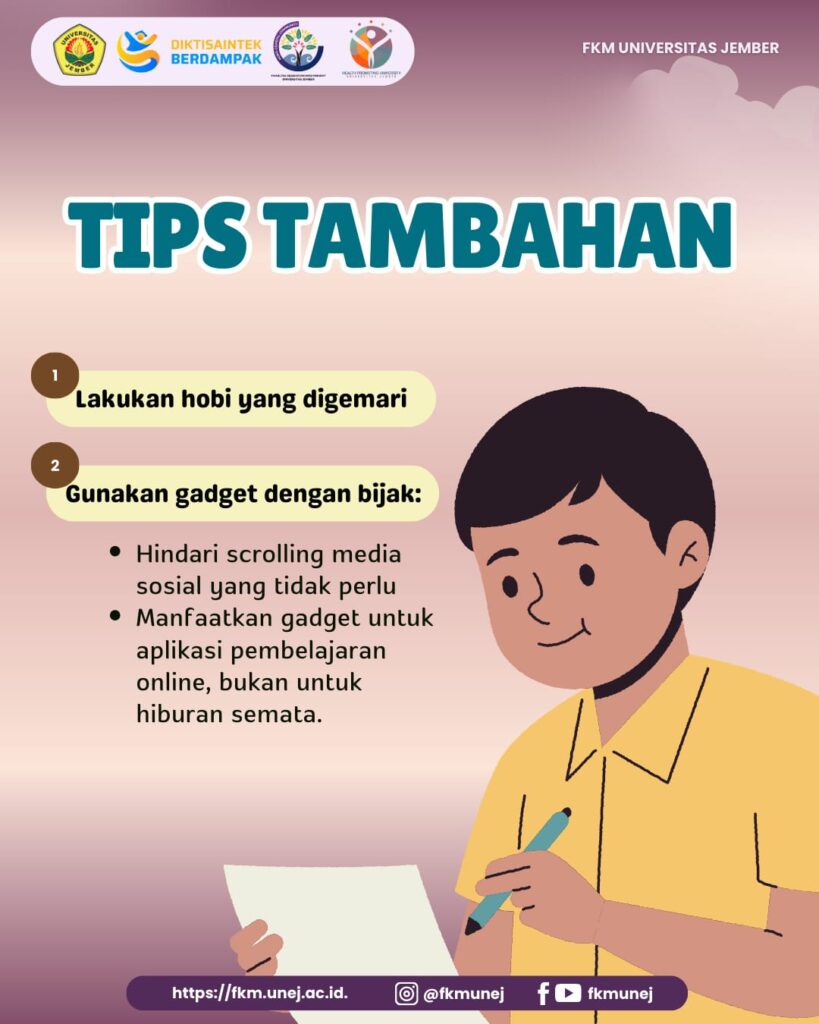 Sementara itu, mahasiswa perlu membuat jadwal belajar yang realistis dengan menyisihkan waktu istirahat di antara sesi belajar. Penting untuk meluangkan waktu bagi diri sendiri (me-time) seperti meditasi sejenak untuk menenangkan pikiran. Penggunaan gadget pun harus bijak; gunakan untuk aplikasi pembelajaran dan hindari scrolling media sosial yang tidak perlu.