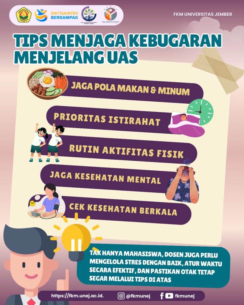 Berikut adalah rangkuman edukasi kesehatan mengenai kiat bugar jelang akhir semester bagi seluruh civitas akademika.