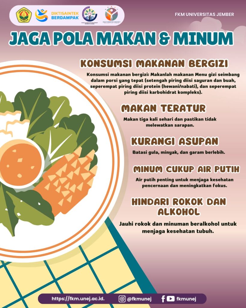 Pola makan juga harus dijaga dengan makan tiga kali sehari dan tidak melewatkan sarapan. Selain itu, sangat penting untuk mencukupi kebutuhan air putih guna menjaga fokus serta membatasi asupan gula, garam, dan minyak berlebih. Hindari pula rokok dan alkohol demi menjaga kesehatan tubuh secara menyeluruh.