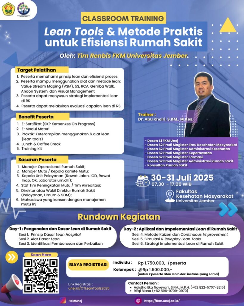 Era Jaminan Kesehatan Nasional (JKN) menuntut rumah sakit untuk mampu menyediakan layanan kesehatan yang tidak hanya efektif, tetapi juga efisien. Menjawab tantangan tersebut, sebuah pelatihan komprehensif bertajuk “CLASSROOM TRAINING: Lean Tools” akan segera hadir, membekali para praktisi dan pengelola rumah sakit dengan keterampilan manajerial dalam tata kelola sumber daya dan proses bisnis yang efisien.
