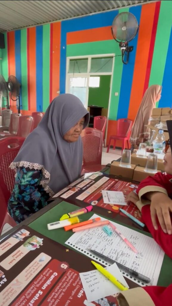 Selain pemeriksaan fisik, para mahasiswa juga memberikan edukasi secara personal (person to person) kepada setiap lansia. Mereka menjelaskan hasil pemeriksaan dan memberikan saran tentang cara pencegahan penyakit kronis PTM.