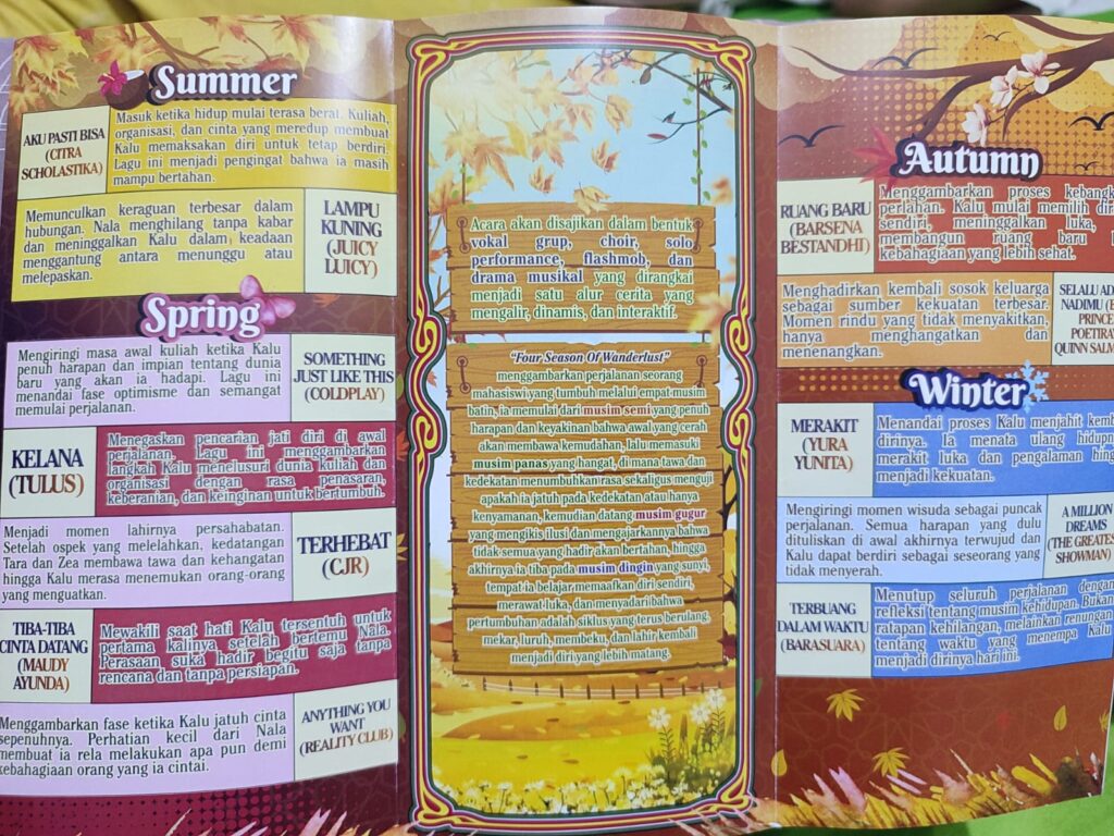 Tema “Four Seasons of Wanderlust” yang diusung kali ini memiliki makna filosofis yang mendalam. Tema ini menggambarkan perjalanan seorang mahasiswa yang tumbuh melalui empat “musim batin”. Penonton diajak menyelami fase “Spring” (Musim Semi) yang penuh harapan dan optimisme awal kuliah, diiringi lagu-lagu bernuansa ceria seperti Something Just Like This dan Terhebat. Cerita berlanjut ke fase “Summer” (Musim Panas), masa di mana ujian hidup mulai datang, mulai dari tekanan kuliah hingga konflik asmara yang digambarkan lewat lagu Lampu Kuning dan Aku Pasti Bisa.