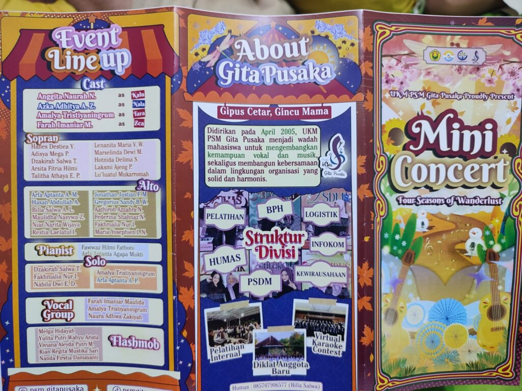 Unit Kegiatan Mahasiswa Paduan Suara Mahasiswa (UKM PSM) Gita Pusaka dari Fakultas Kesehatan Masyarakat Universitas Jember (FKM UNEJ) sukses menyelenggarakan acara Mini Concert bertajuk “Four Seasons of Wanderlust”. Bertempat di Gedung Soejarwo, acara ini menyuguhkan pertunjukan seni yang memukau penonton melalui perpaduan vokal, musik, dan drama teatrikal. Konser ini tidak sekadar menampilkan paduan suara konvensional, melainkan dikemas dalam format drama musikal yang dinamis dan interaktif. Alur cerita dibangun mengalir menyatukan berbagai elemen pertunjukan mulai dari vocal group, choir (paduan suara), penampilan solo, hingga flashmob.