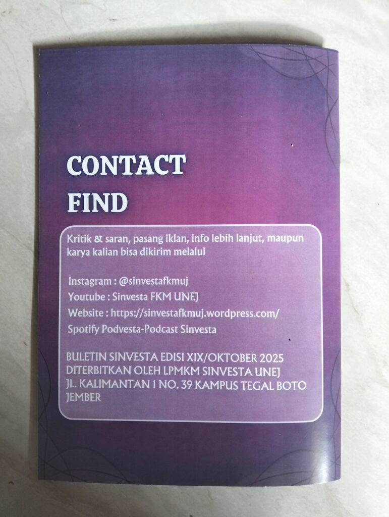 Buletin Sinvesta merupakan salah satu program kerja tahunan dari UKM LPMKM Sinvesta Fakultas Kesehatan Masyarakat Universitas Jember. Pada tahun 2025, tim redaksi kembali menghadirkan dua edisi sekaligus, yaitu Buletin Sinvesta Edisi XVIII dengan tema “Mahasiswa dan Artificial Intelligence: Peluang, Tantangan, dan Inovasi di Era Digital” serta Buletin Sinvesta Edisi XIX bertema “Overthinking dan Produktivitas: Tantangan Mental di Kalangan Mahasiswa”. Kedua edisi ini menjadi wadah bagi mahasiswa untuk menuangkan gagasan, hasil tulisan, dan pandangan kritis terhadap isu-isu yang dekat dengan kehidupan akademik dan sosial mahasiswa.