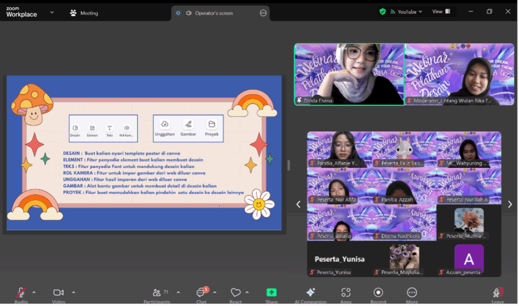 Dalam pelaksanaannya, jumlah peserta yang mengikuti acara Webinar Pelatihan Desain (WPD) 2025 sejumlah 64 peserta yang terdiri dari masyarakat umum khususnya pelajar dan mahasiswa. Sebelum acara Webinar Pelatihan Desain (WPD) 2025 dimulai, panitia mempersiapkan media Zoom meeting dan melakukan briefing panitia yang dipandu oleh Sie Acara pada pukul 07.30 WIB serta melakukan presensi panitia. Kemudian pada pukul 08.30 WIB, peserta mulai memasuki Zoom meeting.